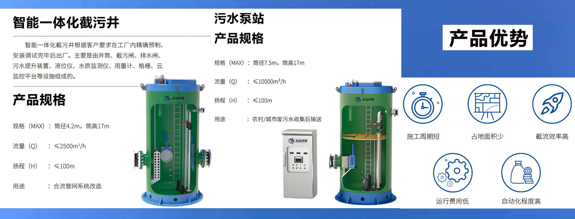 智能一體化截污井|雨污分流井根據客戶要求在工廠內精確預制、安裝調試完畢后出廠。主要是由井筒、截污閘、排水閘、污水提升裝置...